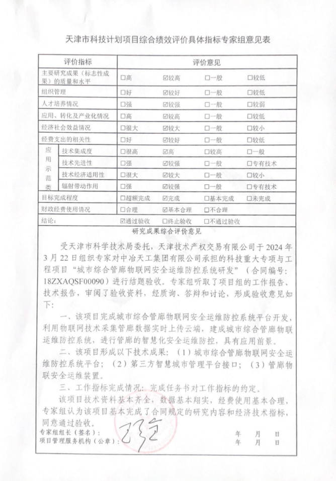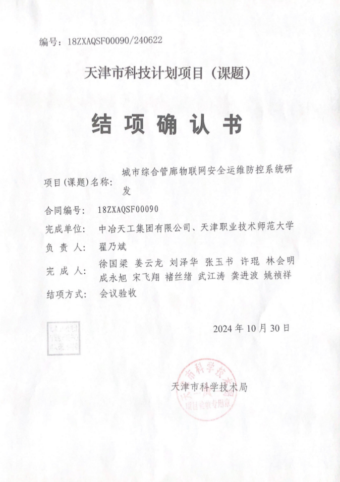 近日,由中冶天工承擔(dān)的天津市科技計(jì)劃項(xiàng)目《城市綜合管廊物聯(lián)網(wǎng)安全運(yùn)維防控系統(tǒng)研發(fā)》通過結(jié)項(xiàng)驗(yàn)收。該項(xiàng)目歷經(jīng)數(shù)年艱苦攻關(guān),系統(tǒng)地解決了基于物聯(lián)網(wǎng)技術(shù)的地下綜合管廊及管線在運(yùn)行使用過程中的風(fēng)險(xiǎn)評(píng)估和安全監(jiān)管問題,并取得了一系列重要的科研成果,為推動(dòng)管廊運(yùn)維技術(shù)領(lǐng)域的進(jìn)步和產(chǎn)業(yè)發(fā)展作出了重大貢獻(xiàn)。